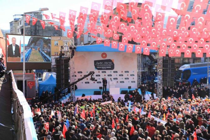 AK Parti Genel Başkanvekili Binali Yıldırım'ın kürsüden karşıladığı Cumhurbaşkanı Erdoğan, "Sizinle Zonguldak'ta yüz yüze görüşmek, hasbihal etmek, hasret gidermek için iki hafta önce planladığımız ziyareti olumsuz hava şartları nedeniyle bugüne ertelemek zorunda kalmıştık. Bu günde soğuk algınlığı ve sesimizin kısıklığı sebebiyle Zonguldak'a gelemedik. Buna rağmen Prof. Dr. Teoman Duralı Tünelleri başka olmak üzere şehrimize kazandırdığımız yatırımların resmi açılışını canlı bağlantı ile de olsa gerçekleştirmek istedik. Cumhuriyetle birlikte il statüsü kazanan Zonguldak hep çalışmanın alın terinin emeğin sembolü olmuştur. Madenlerde ve demir çelik fabrikalarında çalışan işçilerin başlarındaki baret, ellerindeki kara, yüreklerindeki ateş bu şehrin üretim gücünün sembolüdür. Filyos projesi başta olmak üzere yeni yatırımlarla tüm bölgenin yeni lojistik üssü haline dönen bu şehrin üstünde artık yeni bir sayfa açılıyor. Zonguldak'a bu aydınlık geleceğe uygun yatırımlarla büyük ve güçlü Türkiye'nin parlayan yıldızı haline getirme gayretindeyiz. Resmi açılışlarını yapacağımız yatırımlar da buna yöneliktir. Tünellere geçtiğimiz aylarda ülkemizin fikir ve ilim dünyası bu şehrin evladı Prof. Dr. Teoman Duralı'nın ismini verdik. Yapımı tamamlanan Zonguldak-Kilimli yolunun Prof. Dr. Teoman Duralı 1 ve 2 tünellerini Karaelmas ve Uzunkum kavşaklarının resmi açılışını buradan yapıyoruz. Yatırım tutarı 1 milyar 150 milyon lira olan bu proje sayesinde lira olan bu proje sayesinde 40 dakika aşuren ulaşım 5 dakikaya inecek. Yolun yarı yarıya kısalması, seyahat süresinin azalması sayesinde Zonguldak ile Kilimli adeta bütünleştirmiş oluyoruz. Açılışını yapacağımız bir başka ulaştırma yatırımı Zonguldak-Ereğli yolu Değirmenağzı 1-2 tünelleri, Kozlu viyadüğü, Ereğli hastane, Karaelmas köprü ve kavşaklarıdır. Yatırım tutarı 1 milyar 180 milyon lira olan bu proje sayesinde Zonguldak ile en büyük ilçesi Kdz. Ereğli arasındaki ulaşımı daha hızlı ve konforlu şekilde sağlanabilecektir. Her iki istikametteki tünel, kavşak projeleriyle şehrimize hayırlı olmasını diliyorum. Zonguldak'ın kalkınmanın temel altyapısı olan ulaşım da bu imkanları en iyi şekilde değerlendireceğine hiç şüphe duymuyorum. Şehrimizin merkezindeki ve çeşitli ilçelerindeki enerji iletim hatları, trafo merkezleri gibi alt yapılar yenilendi, genişletildi. Toplamda 326 milyon liralık yatırımla tamamlanan enerji projeleriyle üç beldemize getirilen doğalgaz hatlarımızın resmi açılışın yapıyoruz. TOKİ tarafından Üzülmez, Terakki mahallelerimizle Çaycuma, Devrek ilçelerimize 266 milyon liralık yatırımla bin 693 konut, cami ve ticaret merkezi inşaatı tamamlandı. TOKİ projelerinin açılışını da buradan gerçekleştiriyoruz. Çeşitli kurum, üniversite ve belediyelerimize ait yatırımlarımızı da buradan yapıyoruz. Toplamda 3 milyar 404 milyon liralık yatırımlar hayırlı olmasını diliyorum. Bu yatırımların Zonguldak'a kazandırılmasında emeği geçen bakanlıklarımıza kurumlarımıza, belediyelerimize, işçisinden mühendisine herkese çok teşekkür ediyorum" dedi.