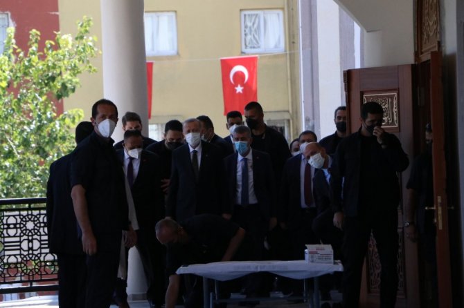 Atatürk Kültür Merkezi'nde AK Parti Mersin Genişletilmiş İl Danışma Toplantısı'na katılan Cumhurbaşkanı Erdoğan, cuma namazını merkez Toroslar ilçesine bağlı Halkkent Mahallesi'nde yeni yapılan Emir Sultan Camiinde kıldı. Erdoğan'a bir çok bakan ve milletvekili de eşlik etti. Mersin İl Müftüsü Şaban Kondi'nin kıldırdığı Cuma namazı sonrası cemaate seslenen Erdoğan, "Cuma namazımızı hep birlikte icra ettik. Rabbim namazımızı, dualarımızı kabul etsin inşallah. Cuma bizim için bayramdır ve bayramı bayram gibi icra etmeyi Rabbim bizlere nasip etsin. Rabbim yar ve yardımcımız olsun. Benim kardeşlerimden istediğim bir olalım, beraber olalım, iri olalım, kardeşliğimizi asla lekelemeyelim. Kardeşliğimize asla gölge düşürmeyelim. Bölmek isteyenlere fırsat vermeyelim. Ne kadar bu konuda bir ve beraber olursak Rabbim gücümüzü o kadar artıracaktır. Tüm geçmişlerimize Allah'tan rahmet diliyorum. Şehitlerimize rahmet diliyorum" dedi.