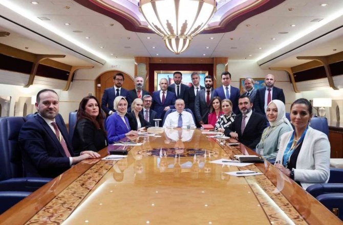 Cumhurbaşkanı Recep Tayyip Erdoğan, resmi ziyaret için gittiği Birleşik Arap Emirlikleri'nden dönüşünde uçakta değerlendirmede bulundu, gazetecilerin sorularını cevapladı. Erdoğan, "Birleşik Arap Emirlikleri'ne gerçekleştirdiğimiz iki günlük resmi ziyareti hamdolsun başarıyla tamamladık. Ziyaretimizin ilk gününde değerli kardeşim Abu Dabi Veliaht Prensi Şeyh Muhammed bin Zayid ile son derece verimli görüşmeler gerçekleştirdik. Türkiye-Birleşik Arap Emirlikleri ilişkilerinin daha da geliştirilmesine yönelik atabileceğimiz ortak adımları ele aldık. İş birliğimizde, son dönemde sağlanan ivmeyi muhafaza etmek ve ileri taşımak konusundaki iradenin karşılıklı olduğunu memnuniyetle müşahede ettik. Temaslarımızda ayrıca bölgesel ve uluslararası meseleler hakkında fikir teatisinde bulunduk. Bu noktada Birleşik Arap Emirlikleri'nin güvenlik ve istikrarına verdiğimiz desteğin altını çizdik. Körfez Bölgesi'nin güvenliğini, kendi güvenliğimizden ayrı görmediğimizi vurguladık. Ziyaretimiz vesilesiyle çeşitli alanlarda toplam 13 mutabakat zaptı ve protokol imzaladık. Savunma sanayii alanında imzalanan niyet mektubuyla önümüzdeki dönemde atılacak ortak adımlara ilişkin koordinasyonu sağlamak üzere anlayış birliğine vardık. Kara ve deniz taşımacılığı alanlarında akdedilen mutabakat muhtırasıyla lojistik maliyetlerinin düşürülmesi sağlandı. Kapsamlı Ekonomik Ortaklık Anlaşması müzakerelerinin gecikmeksizin başlatılması hususunda mutabık kaldık. Ayrıca sağlık ve tıp bilimleri, sanayi ve ileri teknolojiler, iklim değişikliğiyle mücadele, tarım, kültür, gençlik, iletişim, arşiv, meteoroloji, afet ve acil durum yönetimi alanlarında da iş birliğine yönelik önemli anlaşmalar imzaladık. Dost ve kardeş Birleşik Arap Emirlikleri ile ilişkilerimizin ahdi zeminini daha da güçlendirecek tüm bu anlaşmaların ülkelerimiz ve bölgemiz için hayırlı olmasını diliyorum" ifadelerini kullandı.