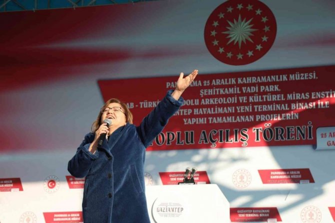 GBB Başkanı Fatma Şahin ise destansı mücadelede şehit düşen 6 bin 317 şehide rahmet dileyerek, "Burada bütün dünyaya 100 yıl önce ecdad şunu söyledi, "İnanan bir milletin bayrağı indirilemez, ezanlar susturulamaz, Şehitkamil'in annesinin baş örtüsü indirilemez, Anasına namusuna göz dikilemez, burası Gaziantep." 100 yıl önce ecdadımız zerdali çekirdeği ile açlığa direndi. 100 yıl sonra dünyanın lezzet başkenti oldu Gaziantep. Burası Gaziantep, burası şehit torunlarının olduğu yer. Burası Gazi'nin torunlarının yaşadığı yer. 100 yıl sonra zaman değişse bile vazifemiz hep aynı. Şartlar değişse bile vazifemiz hep aynı. Sanayi şehri, eğitim şehri, bilim şehri Gaziantep'in karşısında, bu şehrin evlatlarının önünde hiçbir şey duramaz. Gazi unvanından başka Antep'in önünde hiçbir şey duramaz. Cumhurbaşkanı Recep Tayyip Erdoğan'la ikinci 100 yılımız hayırlı olsun" diye konuştu.