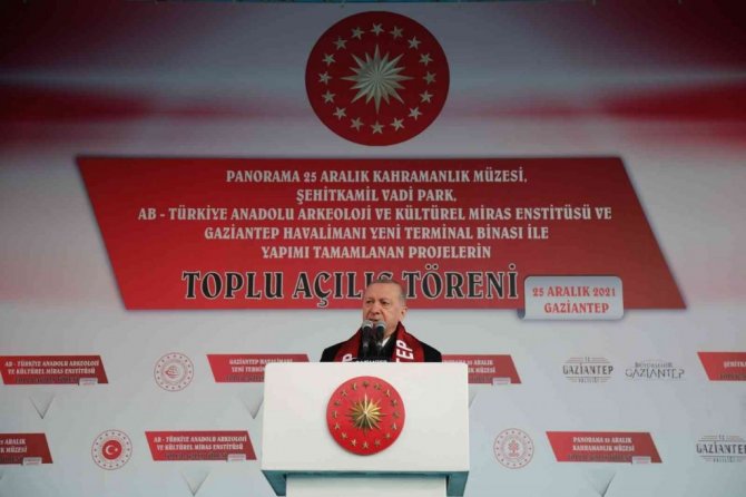 Konuşmasında Büyükşehir Belediyesi'nin projelerinden övgüyle bahseden Cumhurbaşkanı Erdoğan, "Gaziantep Büyükşehir Belediyesi, çeşitli ilçelerimizde tam 9 tane yüzme havuzu inşa etti. Güneykent Yunus Emre Cemevi, Profesör Doktor Alâeddin Yavaşca Eğitim ve Sanat Merkezi, Panorama 25 Aralık Kahramanlık Müzesi, Anadolu Arkeoloji ve Kültürel Miras Enstitüsü, Sezai Karakoç ve Edebiyat Parkı da yine büyükşehir Belediyemizin şehrimize kazandırdığı örnek projelerdendirArkeoloji ve Kültürel Miras Enstitümüzün de her tarafından tarih fışkıran Gaziantep'le birlikte tüm bu bölgenin ve ülkemizin geçmişine ışık tutacağına inanıyorum. Burç Yazıbağı Hayvan Barınağı'nı sahipsiz hayvanların sokaklardan alınarak temiz ve güvenli ortamlara taşınması önemli bir hizmettir. Tüm belediyelerimize de sahipsiz hayvanları sokaktan alarak hem vatandaşlarımızın güvencesi hem de bu canları koruyacak adımları süratle atmaları çağrısında bulunuyorum. Sahip çıkın hayvanlarımıza" ifadelerini kullandı.