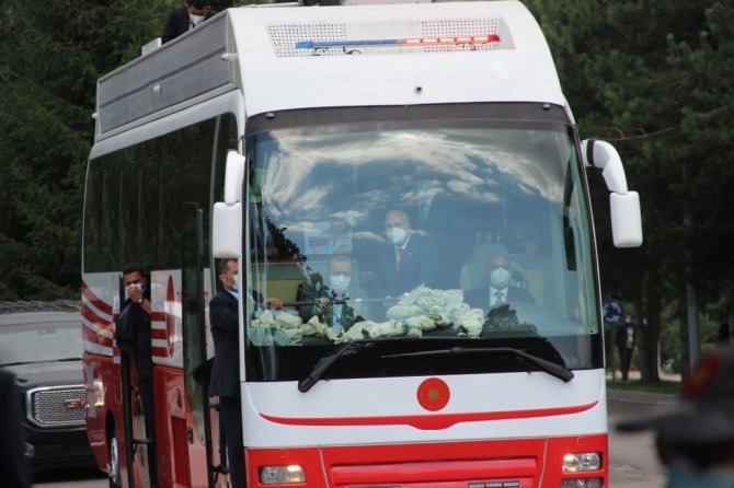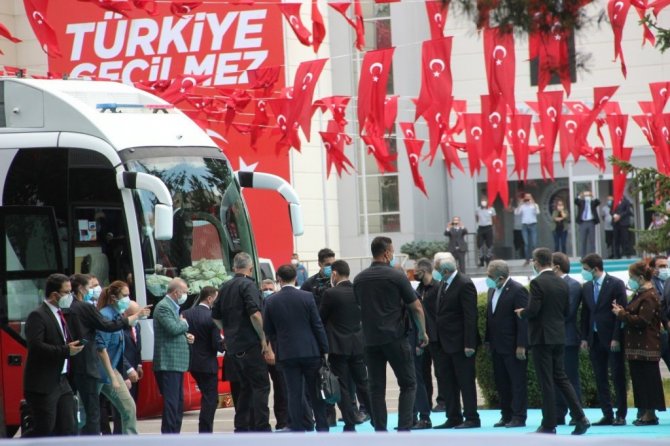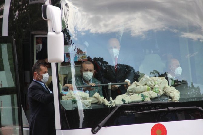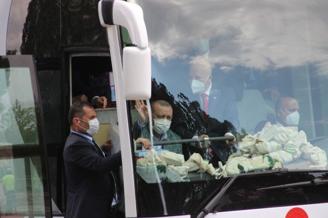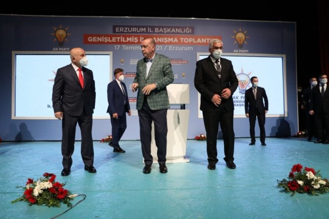 Erdoğan, "Uluslararası alanda ülkemizin hak ve hukukunu savunurken, terör örgütlerine nefes aldırmıyoruz. Şehirlerimizi geliştirecek projeleri adım adım izliyoruz. Önceki hafta Hatay, Sonra Diyarbakır bugün Erzurum'da dadaşlarla kucaklaşıyoruz. Pazartesi günü KKTC'ye gideceğiz, kurban bayramını Kıbrıs Türk halkı ile idrak edeceğiz. Kuzey Kıbrıs'ta pek çok eser ve projeyi hizmete alacağız. Bugünde Erzurum'a yine elimiz boş gelmedik. Yapımı tamamlanan projelerin açılış heyecanını birlikte yaşayacağız. Toplam maliyeti 9.5 milyar lirayı bulan pek çok eserimizi Erzurumlunun hizmetine sunacağız. Salgın şartlarının hafiflemesiyle yeniden il ziyaretlerimizle halkımızla partililerimizle bir araya geleceğiz. Tüm teşkilatlarımızla hepimiz bir vücudun azalarıyız. 13 milyon 500 bin üyesiyle Türkiye'nin en büyük ailesiyiz. Genel başkanın sorumluluğu ne kadar büyükse il başkanının milletvekilinin sorumluluğu o kadar büyüktür. 20 sene önce nasıl istişare ile yola revam olduysak 2023'e giderken yine istişare ile yürümeye devam ediyoruz. Bu toplantılarımız birer demokrasi şölenidir. Bu toplantıları artırarak devam ettirmekte kararlıyız. Ortak akla önem, kolektif bir akıl ile hareket etmek önemlidir. AK Parti Türk siyasetine hala yön veriyorsa 84 milyonun umudu olmaya devam ediyorsa sebebi istişareye gelişime açık olmasıdır. Tevazu yüceltir, kibir düşürür, gurur aldatır, haset bitirir. Geçmiş teki başarılarımızın sırrı geleceğimizin pusulasıdır. Hep milletimizle beraber yürüdük. Bundan sonra da milletimizin gösterdiği istikamette yürümekte kararlıyız. Davamızda karamsarlığı yer olmadığı rehavete gevşemeye yer yoktur. Yanlışlarımızı söylemekten çekinmeyeceğiz. Çalışmalarımızı yürütürken bir duvarın tuğlaları gibi birbirimize kenetlenmekten vazgeçmeyeceğiz" diye konuştu.