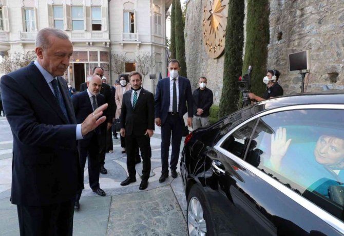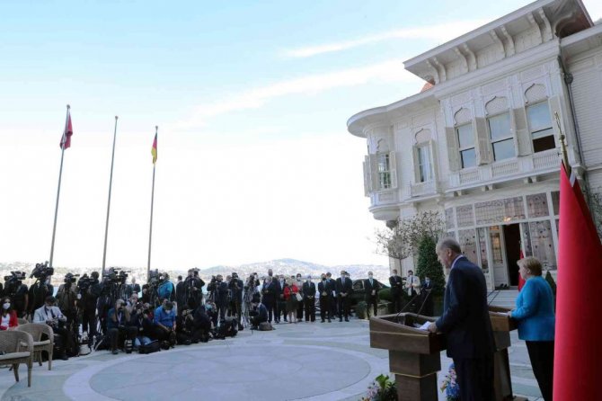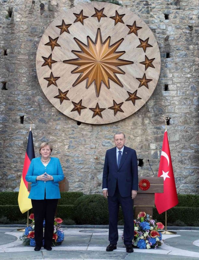 Toplantıda konuşan Cumhurbaşkanı Erdoğan, "Dost ve müttefik Almanya'nın Şansölyesi Sayın Merkel'i ve heyetini İstanbul'a misafir etmekten büyük memnuniyet duyuyorum. Değerli dostum sayın Merkel ile göreve başladığı 2005 yılında bu yana karşılık saygıya dayalı yakın bir diyalog tesis ettik. 16 senendir gerçekleştirdiğimiz görüşmelerde sayın Merkel her zaman sağ duyulu ve çözüm odaklı bir yaklaşık sergiledi. Görev sürecinde AB'nin içinden geçtiği krizlerde liderliği belirleyici oldu. İkili ilişkilerimizde zaman zaman sıkıntılı dönemler yaşasak da bunları aşmayı ve işbirliğimizi çok daha ileri taşımayı daima başardık. Sayın Merkel ile yakın diyaloğumuz yalnızca ikili konularda değil, bölgesel meselelere çözümler geliştirilmesine de ciddi katıklar sağladı. Suriye kaynaklı düzensiz göç krizinin engellenmesine, Suriye kuzeyine insani yardım ulaştırılmasına kadar pek çok hususta sayın Merkel sorumluluk üstlenmekten asla çekinmedi. Sayın Şansölye'ye özellikle Suriye krizinin çözümüne yönelik gösterdiği samimi çabalar için teşekkür ediyorum. Almanya'da gerçekleştirilen federal meclis sonuçlarının Alman halkı için hayırlı olmasını diliyorum. Kurulacak yeni hükümete ve şansölyesine de muvaffakiyetler diliyorum. Sayın Merkel ile yürüttüğümüz başarılı çalışmaların yeni hükümet döneminde de aynı şekilde devam etmesini temenni ediyorum" ifadelerini kullandı.
