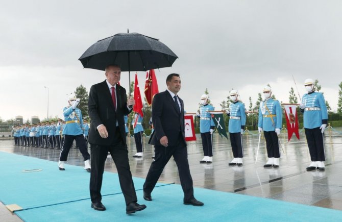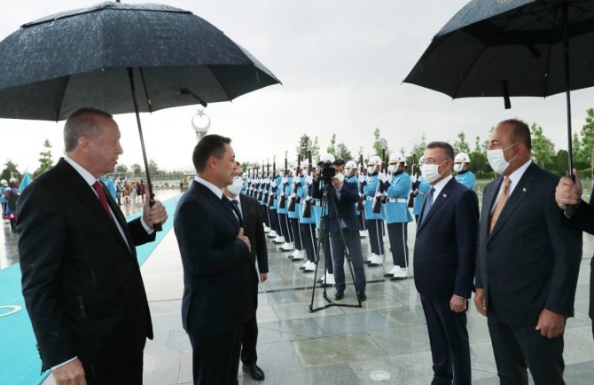 Cumhurbaşkanı Erdoğan, tören kıtasını selamlama sırasında konuk Cumhurbaşkanı Caparov'a şemsiye tuttu. İki lider tören kıtasını yoğun yağmur nedeniyle şemsiye altında selamladı. Heyetlerin takdimi sonrası Erdoğan ve Caparov, merdivenlerde Türkiye ve Kırgızistan bayrakları önünde gazetecilere poz verdi.