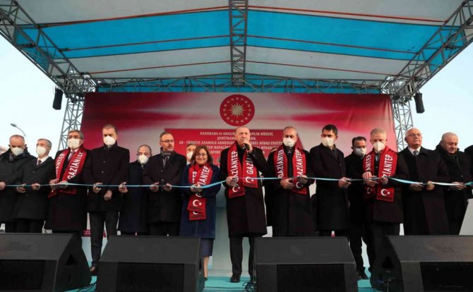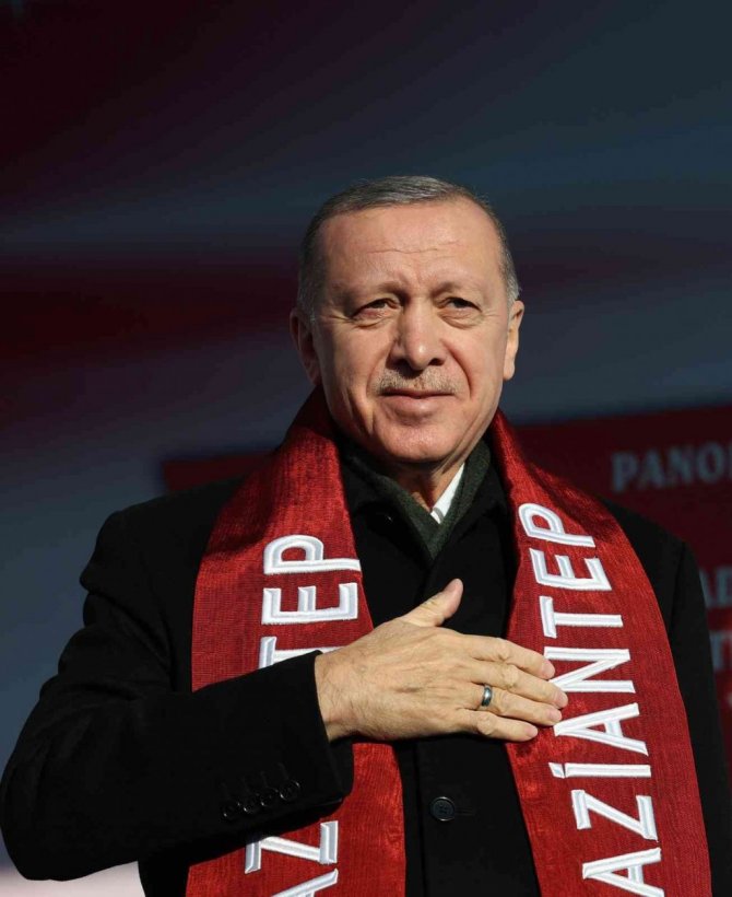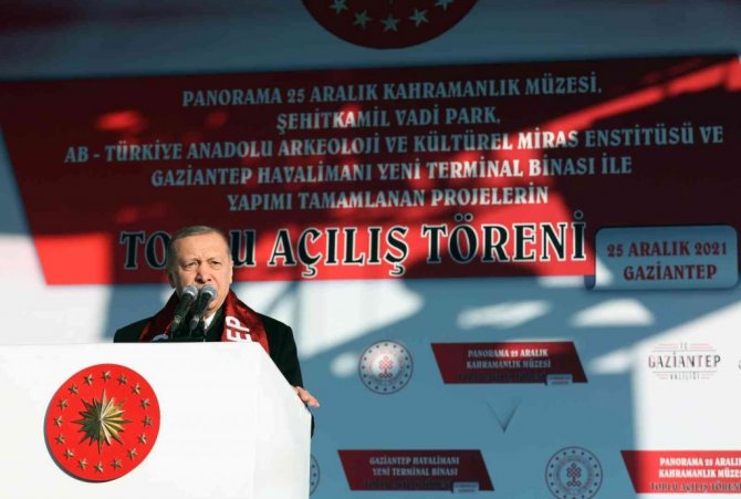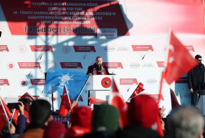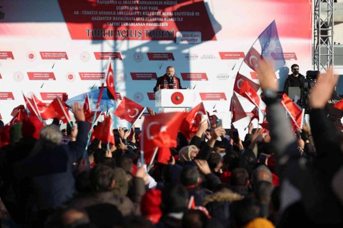 Erdoğan, konuşmasında kendisine gösterilen karşılamadan memnuniyetini dile getirerek, "Havalimanından bu yana caddenin sağı soluyla büyük bir duruş ve karşılama gördük. Gaziantep'i zaten hep böyle gördük. Siz bizi yola çıktığımızdan bu yana yalnız koymadınız, her zaman yanımızda oldunuz. Biz de Gaziantep'i özlemişiz. Antep'i Gaziantep yapan ruh, maşallah tüm canlılığıyla tüm haşmetiyle karşımda duruyor. Bugün Gaziantep'in düşman işgalinden kurtuluşunun 100'üncü yılı. Antep'i savunurken şehit düşen genciyle yaşlısıyla binlerce kahramanın her birini rahmetle tanzim ediyorum. Rabbim bir daha bu şehre düşman ayağı değdirmesin. Bir asır önce istiklal ve istikbal ateşi yakanların torunları, ekonomi ve insani kalkınmanın meşalesini taşıyorlar" şeklinde konuştu.