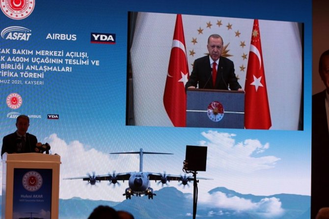 Kayseri 12. Ana Üs Komutanlığı 2'nci Hava Bakım Fabrika Müdürlüğü FASBAT Tesisleri'nde düzenlenen programa Telekonferans ile katılan Cumhurbaşkanı Recep Tayyip Erdoğan, "Birilerinin sürekli "peşkeş çekiyorlar" diyerek karaladığı projeler esasında Türk Savunma Sanayinin geleceğine yapılan en kritik yatırımlardır. Hisselerin doğrudan veya dolaylı olarak kamuya ait savunma sanayi şirketler kendi alanlarında dünya markası haline geliyor. Savunma Sanayi Başkanlığımızın rehberliğinde özel sektör kuruluşlarımız çok sınırlı imkanlarla gerçekten çok büyük başarılara imza atıyorlar" diye konuştu. Cumhurbaşkanı Recep Tayyip Erdoğan, yaptığı konuşmada, Türkiye'nin silah, mühimmat ve askeri techizatlarda dışa bağımlığının bedelini çok ağır ödediğini ifade ederek, "Bugün Türk Havacılık tarihinde kritik bir projeyi daha hayata geçirmenin sevincini yaşıyoruz. FASBAT Uçak Bakım Tesisleri'nin Türk Silahlı Kuvvetlerimize, milletimize ve ülkemize hayırlı uğurlu olmasını diliyorum. Ordumuzun ihtiyaçları doğrultusunda A400M FASBAT Uçak Bakım Tesisleri, bu projeyi 14 ay gibi rekor bir seviyede tamamladık. Uçak bakım tesislerinin inşasını gerçekleştiren, yüklenici firmalarımızı, projede görev alan mühendisinden işçisine herkesi tebrik ediyorum. Bu önemli projeyle aynı anda A400M büyüklüğünde 2 uçağın bakımı ile yenilemesinin yapılabileceği ilk ve tek tesisi ülkemize kazandırdık. FASBAT ile Airbus arasında imzalanan sözleşme ile A400M uçağının yenileme işlemlerinin 2. Ana Bakım Fabrika Müdürlüğü'nde yapılması sayesinde, yılda 125 milyon TL'nin ülkemizde kalması sağlanmıştır. Yine bu sözleşme kapsamında Kayseri 2. Hava Bakım Fabrika Müdürlüğü, dünyada Airbus DNS tesisleri dışında ilk ve tek bakım, yenileme ve onarım merkezi haline gelmiştir. Türkiye bu konuda tüm dünyaya hizmet verebilecek ve kazandığı yeteneklerin ihracatını da yapabilecektir. Ülkemizi savunma sanayide dışa bağımlılıktan tamamen kurtarıncaya kadar, bu yatırımlarımızı arttırarak devam ettireceğiz. Çünkü biz geçmişte silah, mühimmat ve askeri teçhizat bakımından dışa bağımlılığın bedelini çok ağır ödemiş bir ülkeyiz" şeklinde konuştu.