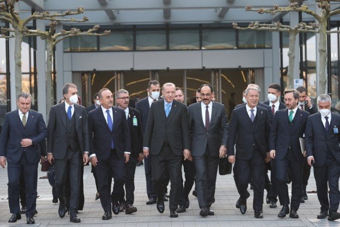 Cumhurbaşkanı Erdoğan, "25 Şubat'ta video konferans yöntemiyle düzenlenen Zirve'nin ardından NATO'nun bir kez daha birlik ve dayanışma mesajı vermesi anlamlıdır. Türkiye'nin, Ukrayna'nın toprak bütünlüğüne ve egemenliğine 2014 yılından bu yana sergilediği kuvvetli destek, herkesin malumudur. Kırım'ın ilhakını tanımadığımızı ve tanımayacağımızı her fırsatta ifade ettik. Etmeyi de sürdürüyoruz. Zirve vesilesiyle Ukrayna'nın toprak bütünlüğüne yönelik desteğimizi bir kez daha güçlü biçimde vurguladım. Rusya'nın Ukrayna'ya saldırısıyla ilgili tutumumuz da bu ilkeli politikamızla uyumludur ve nettir" dedi.