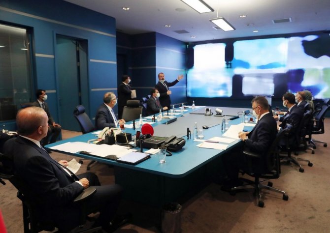 Cumhurbaşkanlığı Külliyesi Devlet Bilgi Koordinasyon Merkezi'nde orman yangınlarıyla ilgili yapılan toplantıya başkanlık yapan Cumhurbaşkanı Erdoğan, orman yangınlarına müdahalede gelinen son noktaya ilişkin bilgiler aldı.