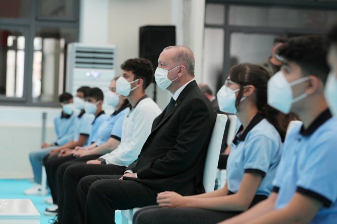 Korona virüs salgınının son 1.5 yılda dünyanı derinden sarstığını vurgulayan Erdoğan, "Salgını kontrol altında almak için hemen her ülke sokağa çıkma yasağı dahil çok sert tedbirlere başvurdu. Biz de virüsün öldürücü etkisinin yüksekliği sebebiyle geçtiğimiz dönemde ihtiyatlı davranmak zorunda kaldık. Öğretmenlerimizin, ailelerimizin, öğrencilerimizin sağlığını tehlikeye atmamak için azami hassasiyet gösterdik. Bilim kurulumuzun tavsiyesi doğrultusunda salgının seyrine göre kimi zaman okulları açarak, daha çok uzaktan eğitimle bu dönemi geride bıraktı. Salgının yol açtığı sıkıntılara rağmen eğitim faaliyetlerini ülke çapında kesintisiz sürdürebilen birkaç devletten biri olduk. Devletimiz tüm imkanlarını seferber ederek salgının yoğun seyrettiği dönemlerde evlatlarımızın eğitimden kopmamalarını temin ettik. Bu kapsamda 2 milyon tablet bilgisayarı öğrencilerimize ulaştırdık. Yine bu dönemde eğitim bilişim ağı dediğim televizyon ve internet platformları ile uzaktan eğitimi başarı ile yürüttü. TRT EBA İlkokul, TRT EBA ortaokul ve TRT EBA lise kanallarından eğitimin devamını temin ettik. Uzaktan eğitimde çocuklarımızın kendi öğretmenleri ile aynı sınıftaymış gibi ders yapabilmeleri için EBA canlı dersleri devreye aldık. Türkiye'deki tüm cep telefonu abonelerine aylık 8 GB kadar EBA'ya ücretsiz erişim sağladık. Bu adımları atarken diğer yandan yüz yüye eğitimin ikamesinin olamayacağı gerçekliğinden hareketle yeni eğitim öğretim yılı için hazırlıkları devam ettirdik. Özellikle aşının etkinliğine dair bilimsel verilerin açıklanması bize yüz yüze eğitim konusunda daha çok cesaretlendirdi. Hazırlık sürecinde bilim insanlarımızın yanı sıra eğitimin tüm paydaşlarının fikrine başvurduk. Mili Eğitim ve Sağlık Bakanlığımız okullarda alınması gereken önlemeleri birlikte belirlediler. Hijyen, temizlik malzemeleri, maske tedarikini sağlayarak velilerimizin çocuklarını güvenle okula gönderebileceği bir altyapı sağladık" diye konuştu.