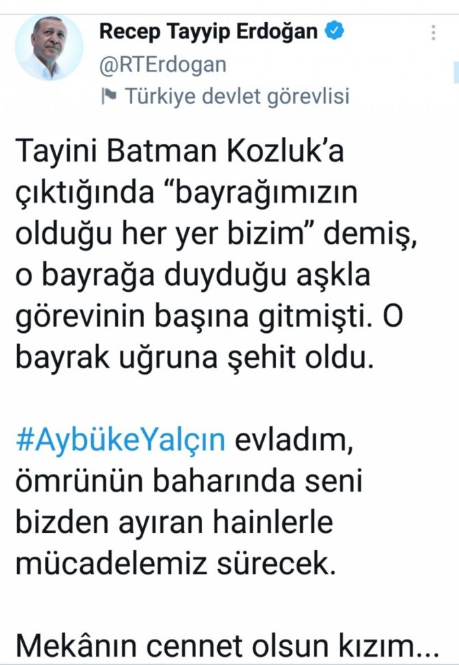 Cumhurbaşkanı Erdoğan, ilk görev yeri Kozluk'ta 9 Haziran 2017 günü karne dağıttıktan sonra evine dönerken teröristler tarafından şehit edilen 22 yaşındaki öğretmen Aybüke Yalçın'ı şehit edilişinin 4. yıl dönümünde unutmadı. Sosyal medya hesaplarından Aybüke Yalçın'ın fotoğrafını paylaşan Erdoğan, paylaşımına şu notu düştü: