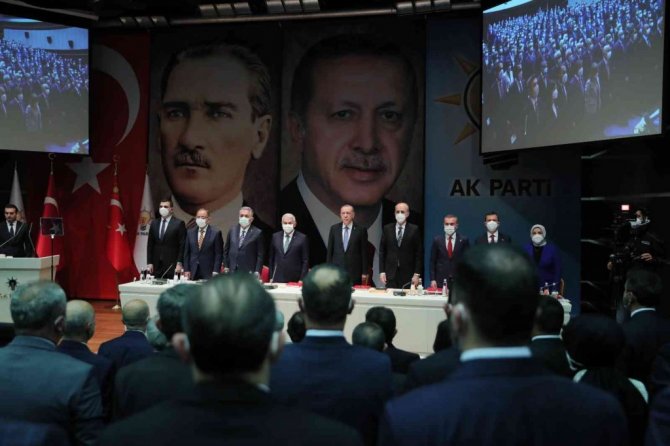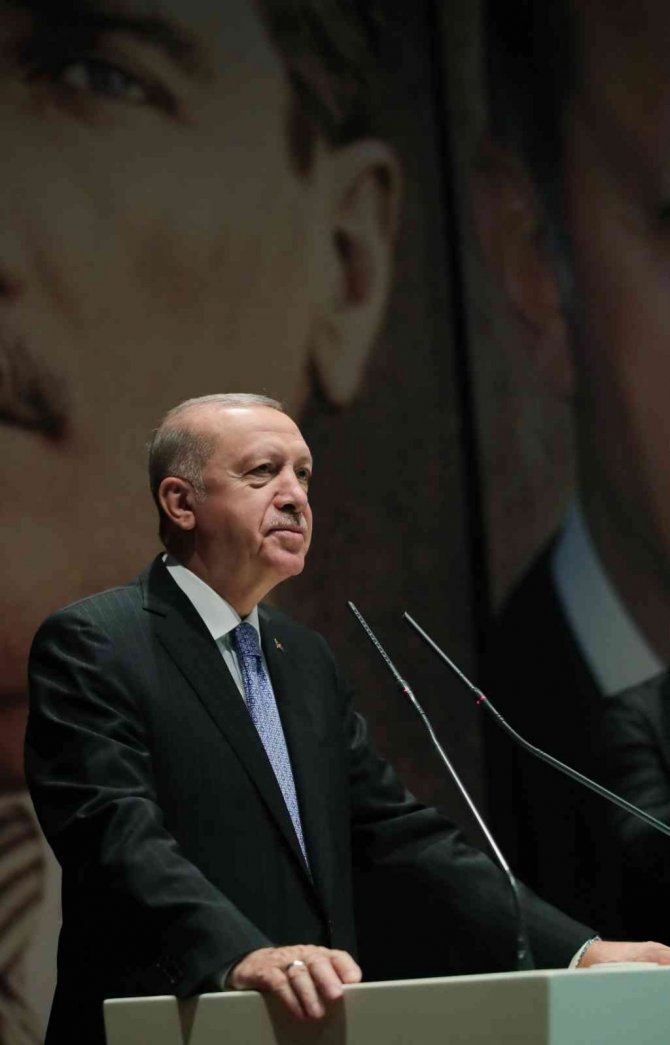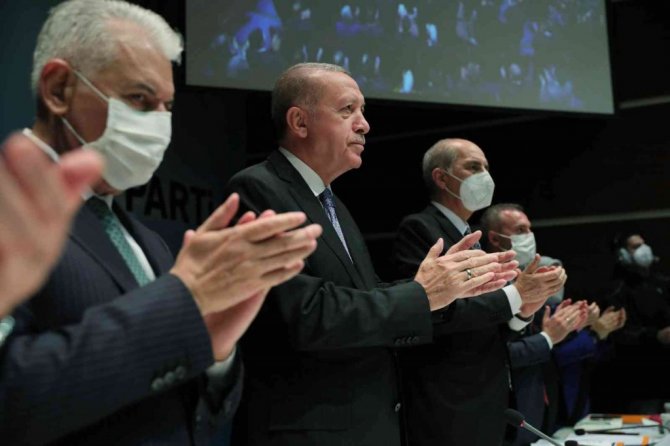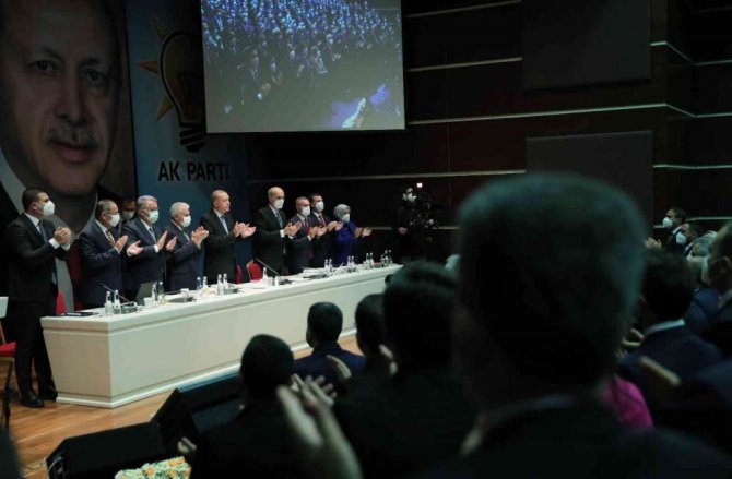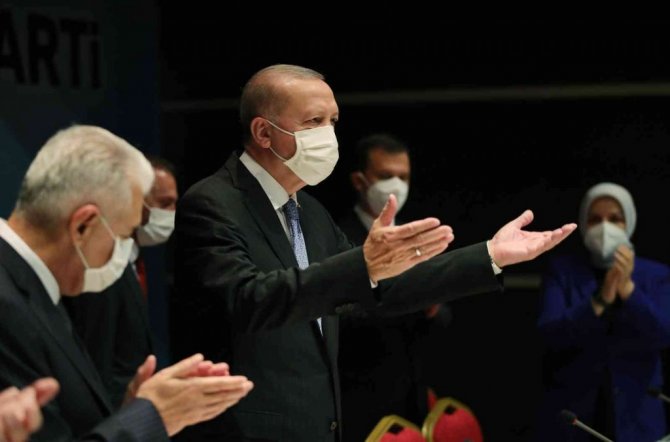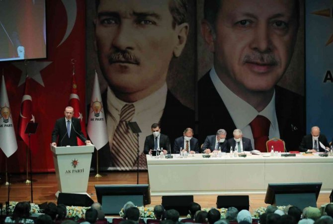 AK Partililere seslenen Erdoğan, "Milletimiz tarafından kurulan, milletimizin gösterdiği istikamette, milletimizle birlikte yol yürüyen bir partidir. Yaptığımız her eseri, her hizmeti milletimiz için hayata geçirdik, yaşadığımız her badirenin üstesinden milletimizden aldığımız destekle geldik, bunun için 2023 "e giden süreçte 84 milyon vatandaşımızın her birinin kapısına gideceğiz, elini tutacağız, gönlünü kazanacağız. Onun için yan gelip durmak yok. Çok gayret edeceğiz, çok koşacağız ve şuarada bir buçuk yıl kaldı. Bunu en iyi şekilde değerlendireceğiz. Unutmayınız, bizim boş bıraktığımız her yer karşımızdakiler tarafından yalanla, iftirayla, çarpıtmayla doldurulacaktır. Ülkemizi CHP'nin yalanlarına, iftiralarına terk edemeyiz. Türkiye'yi helalleşme deyip haleldar etmeye çalışan yani bozmaktan, lekelemekten, fesat çıkarmaktan başka iş bilmeyen, Kılıçdaroğlu'nun kifayetsizliğine terk edemeyiz. Meydanı bölücü örgütün güdümündeki HDP'ye de şehit yakınlarına sövmekten başka mahareti olmayan edepsizlere de bırakamayız" dedi.