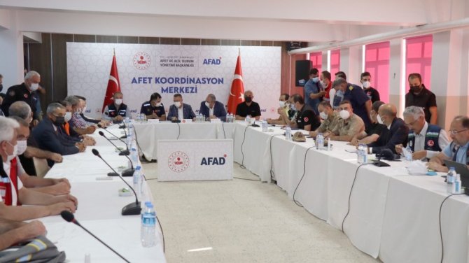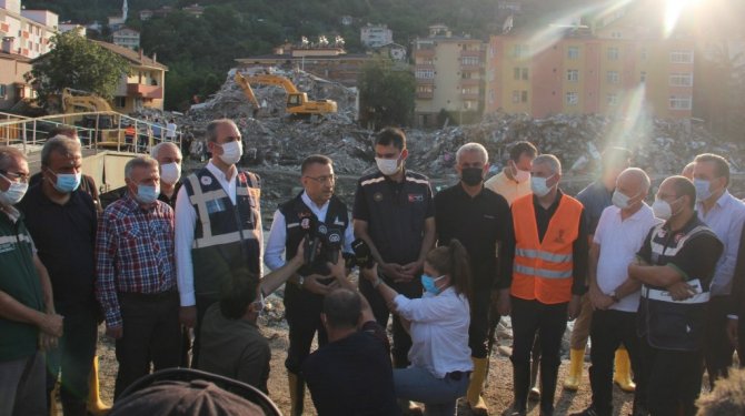 "Belki 100 yılın afetlerinden birisini yaşadık. Biz, Cumhurbaşkanımızın ifade ettiği gibi cana herhangi bir sıkıntı gelmediği sürece mala gelen sıkıntıları, hasarları çok hızlı bir şekilde yerine getiririz. Şu anda Bozkurt'ta yapılan çalışmalar, Kastamonu'da yapılan çalışmalarda yine bunu canlı şahididir. Biz, biraz önce yine kriz merkezimizde gerekli bilgilendirmeyi aldık. Görevli arkadaşlarımızdan aldığımız bilgiler doğrultusunda yine su, beslenme ve barınma anlamında herhangi bir sıkıntının olmadığını görüyoruz. Elektrik ile ilgili ilk andan itibaren yine aynen Ayancık'ta olduğu gibi burada da köylerimizin her birine helikopterle ulaştırılan jeneratörler sayesinde herhangi bir elektrik sıkıtımız olmadığın görüyoruz: Ulaşım ile ilgili ana yollarımız her ilçemiz açılmış durumda. Köy yollarımız açılmış durumda. Sadece bir köy yolumuz hariç, orada da Ulaştırma Bakanlığımız gerekli çalışmalarını sürdürüyor. Tabii ki hasar tespiti herhangi bir afetten son derece önemli. Hasar tespit çalışmalarını Çevre ve Şehircilik Bakanlığımız ilk andan itibaren çok yakinen takip ettiler. Burada da hasar tespit çalışmalarının yoğun olarak tamamlandığını ama hemen arkamızda gördüğünüz yıkılan binalardaki yine bazı binalarda arama kurtarma çalışmaları, yine burada 4 kaybımızın olduğunu biliyoruz. Burada arama çalışmalarımız hassas bir şekilde devam ediyor."