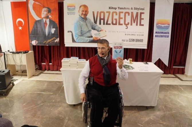 Tekerlekli sandalye ile başladığı akademik yaşantısında profesörlüğe uzanan yolculuğunu ‘Vazgeçme’ isimli kitabında kaleme alan Prof. Dr. Ozan Bahar, Marmarisli okurlarıyla buluştu. Bahar, kitabın kişisel gelişim motivasyon anlamında Türkiye’de çıkan ilk kitap olduğunu söyledi.