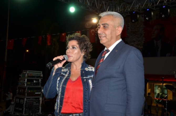Belediye Başkanı Muhammet Karakuş konser arasında sanatçılara çiçek takdim etti, vatandaşların Zafer Bayramı'nı kutladı.