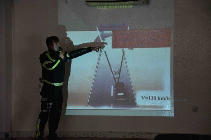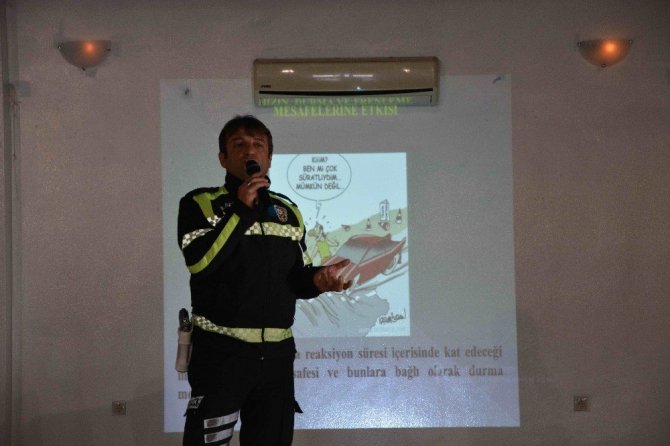 Ticari araç ve okul servis şoförlerine güvenli sürücülük farkındalığının artırılmasına yönelik düzenlenen eğitimde, trafikte uyulması gereken kurallarla ilgili bilgiler verilirken, okul taşıtlarında ve şoförlerde aranan şartlar aktarıldı. Araçlarda, yönetmelikteki standart nitelikte ve sayıda ekipman bulundurulması gerektiğine dikkat çekildi. Sürücülere, güvenli sürüş, takip mesafesi, ehliyet kemerinin önemi anlatıldı.