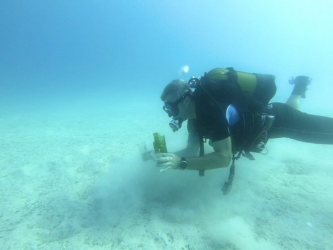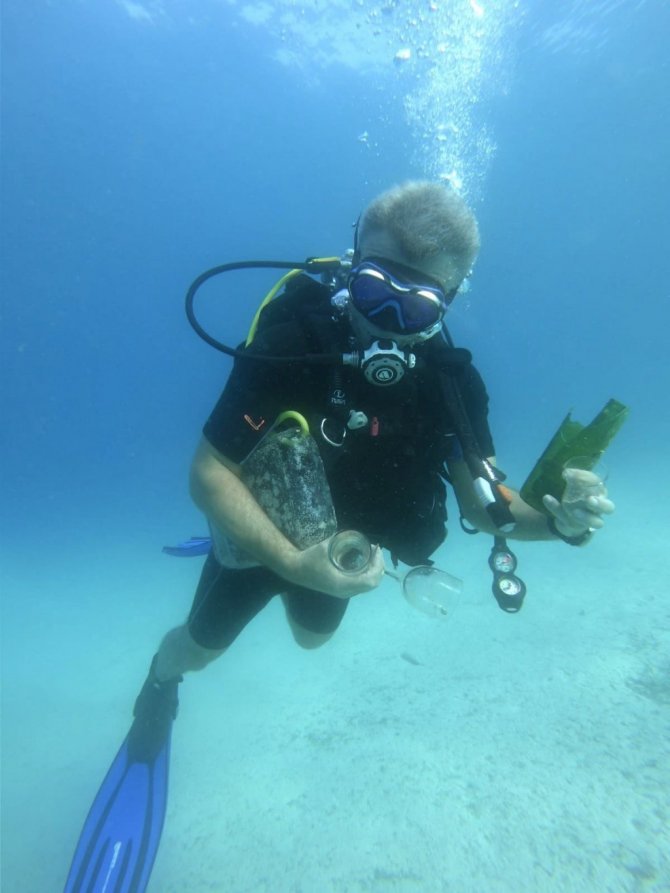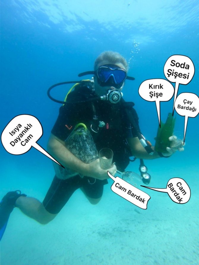 Kaş Kaymakamı Şaban Arda Yazıcı, Kaş Liman Ağzı Koyu'na daldı. Denizin dibinde ısıya dayanıklı cam, cam bardak, kırık şişe, çay bardağı, soda...