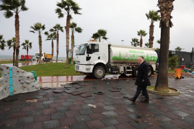 Kuvvetli rüzgar hayatı olumsuz etkilerken, Darıca Belediyesi ekipleri de gün boyunca gerekli tüm önlemleri alarak çalışma yürüttü.