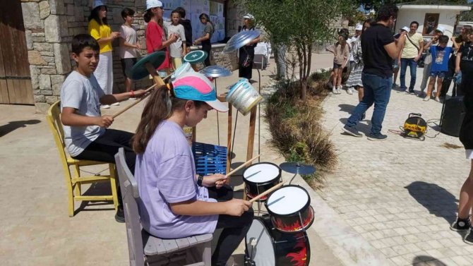 Muğla'nın Datça ilçesinde öğrenciler atık malzemelerden yaptıkları bateri ile çalıp, şarkı söyleyerek, çevre temizliğine dikkat çekti.