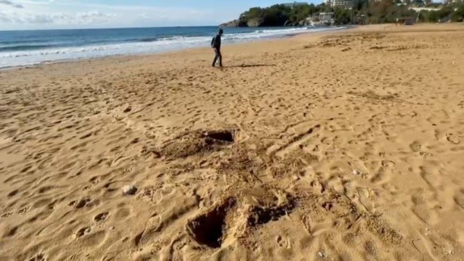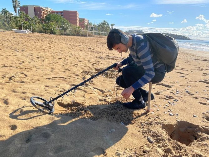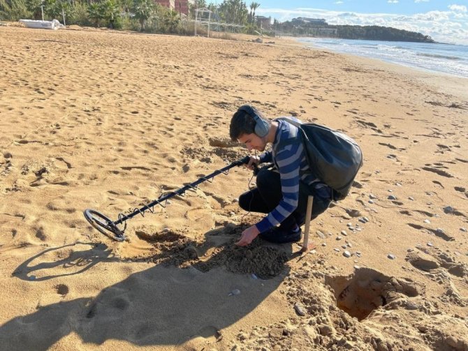 Antalya'nın Alanya ilçesinde yağış ve rüzgarlı hava sonrası define avcıları soluğu sahillerde aldı. Madeni paranın yanı sırada değerli ziynet eşyaları dedektörle arayan avcılar, kazdıkları sahili adeta köstebek yuvasına dönüştürdü.