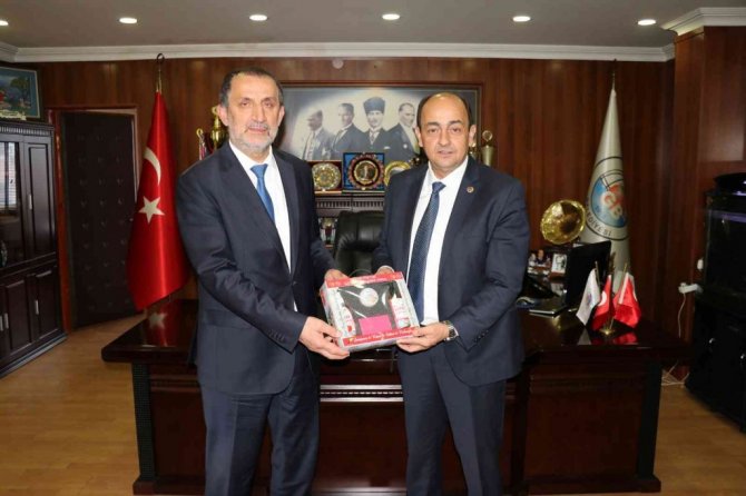 Başkan Demirtaş, Kaynaşlı Belediye Başkanı Şahin'e ziyaretin anısına hediye takdim ederken, toplu fotoğraf çekiminin ardından ziyaret sona erdi.