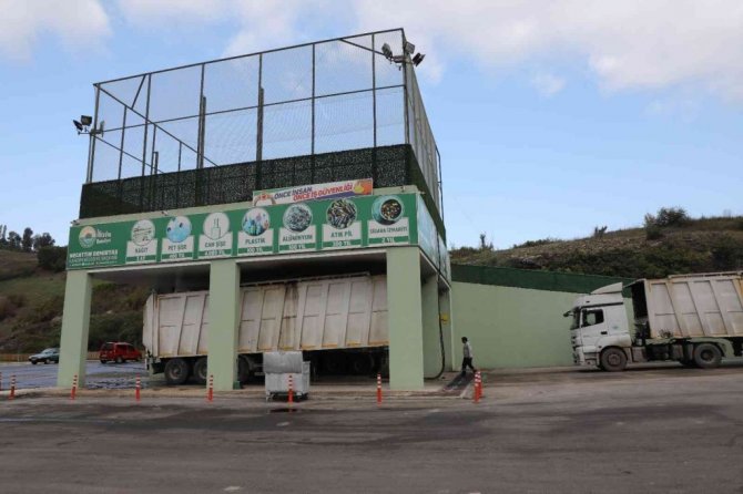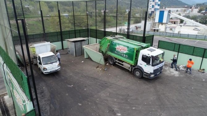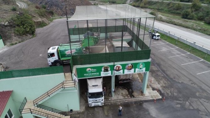 Çöp kamyonları tarafından istasyona bırakılan atıklar, hazır hale getirildikten sonra 50 ton kapasiteli tırlar ile döküm istasyonuna taşınıyor.