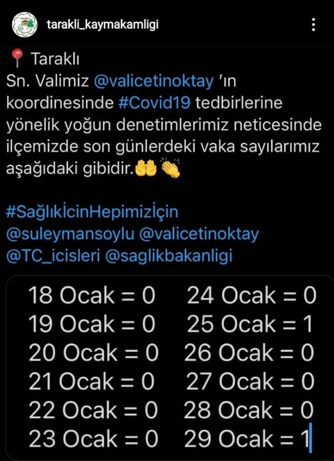Sakarya'da korona virüsle mücadele çalışmaları meyvesini vermeye devam ediyor. Özellikle kırsal bölgelerde kolluk kuvvetleri, kısıtlama saatlerinde denetimlerini sürdürüyor. Bu sıkı takip ve çalışmalar, meyvelerini vermeye başladı. Şehrin 9 bin 500 kişiyle nüfus olarak en küçük ilçesi olan ve "Sakin Şehir" ünvanlı Taraklı ilçesinde vaka sayıları sıfırlandı. Bu durum ise Taraklı Kaymakamlığı'nın sosyal medyasından duyuruldu. İlçede denetimlerin devam ettiğini belirten Taraklı Kaymakamı Özgür Kaya, "Valimizin koordinesinde korona virüs tedbirlerine yönelik yoğun denetimlerimiz neticesinde ilçemizde son günlerdeki vaka sayılarımız oldukça azalmıştır" dedi.