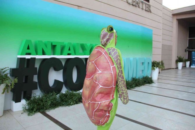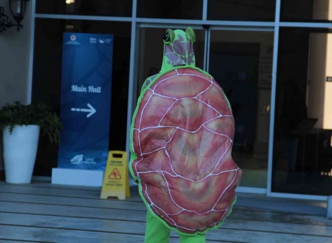 Doğu Akdeniz Çevre Platformu Sözcüsü Sadun Bölükbaşı, konferansında simgesi olan deniz kaplumbağası kostümü ile Antalya'da düzenlenen Akdeniz'in Kirlenmeye...