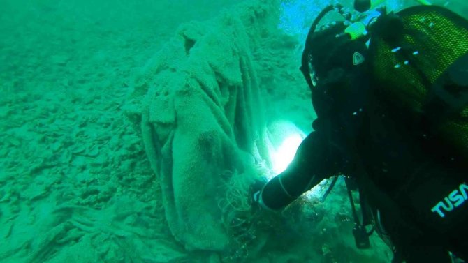 Çanakkale İl Tarım ve Orman Müdürlüğüne bağlı su ürünleri kontrol ekipleri, 50 metre uzunluğunda 250 kilogram hayalet ağ çıkardı.