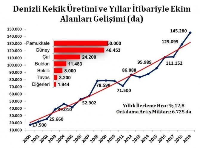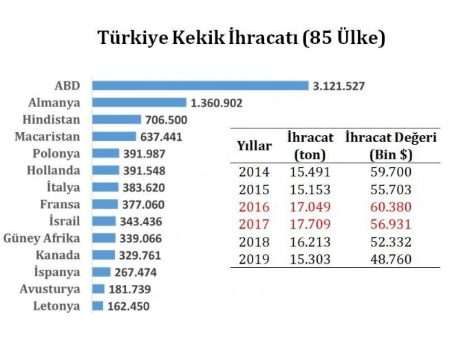 Denizli İl Tarım ve Orman Müdürü Yılmaz Erkaya, dünyada kekiğin dış ticaret hacmi yaklaşık 18 bin ton civarında olduğunu ve bunun yüzde 85’lik kısmının Türkiye tarafından karşılandığını kaydederek, “K...