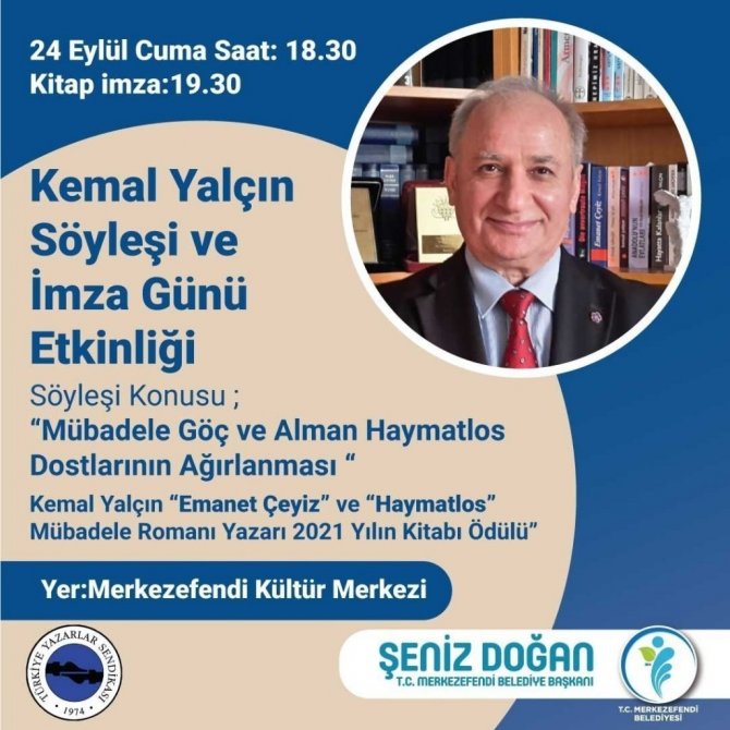 Usta Yazar Kemal Yalçın, 24 Eylül Cuma günü saat 18.30'da "Mübadele Göç ve Alman Haymatlos Dostlarının Ağırlanması" konulu söyleşiye konuşmacı olarak katılacak, saat 19.30'da da kitaplarını okurları için imzalayacak. Merkezefendi'yi hem sanatın hem de kültürün ilçesi yapmak için çalıştıklarını belirten Merkezefendi Belediye Başkanı Şeniz Doğan, tüm Denizlilileri usta yazar Kemal Yalçın'ın söyleşi ve imza günü etkinliğine davet etti. Başkan Doğan, "Dünyaca ünlü Denizlili yazar Kemal Yalçın'ı Merkezefendi'de ağırlamaktan mutluluk duyuyoruz" dedi.