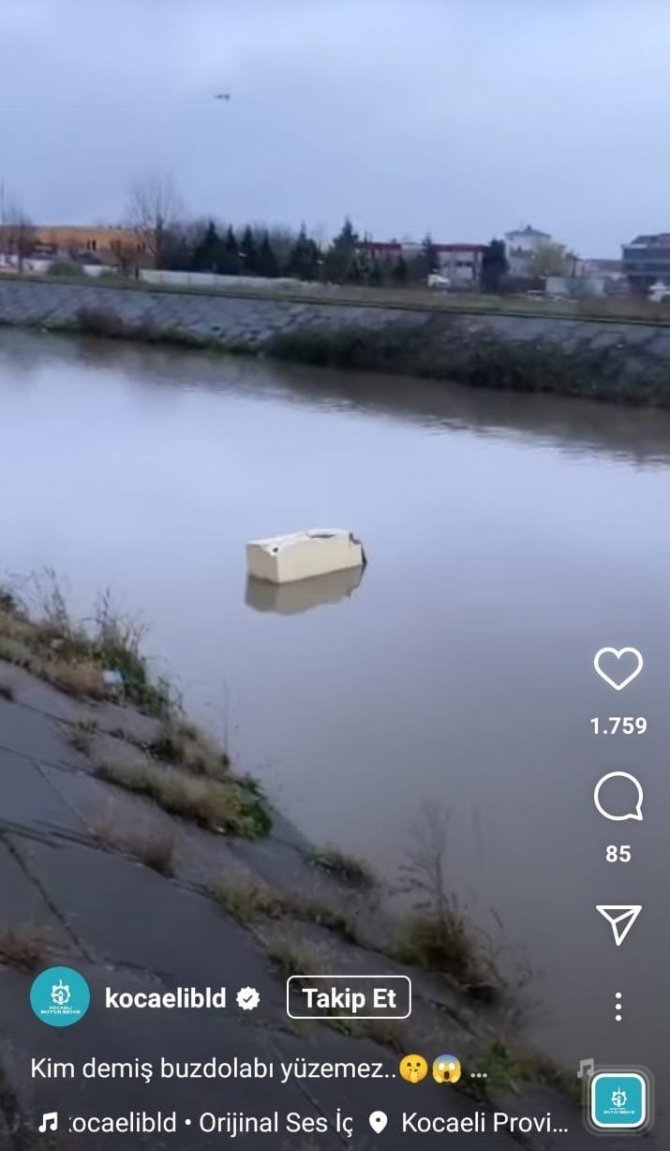 Kocaeli Büyükşehir Belediyesi'nin sosyal medya hesabında dereye atılan buzdolabının görüntüsü, "Kim demiş buzdolabı yüzemez?" notuyla paylaşıldı.
