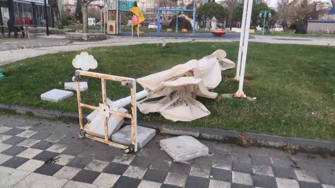Tekirdağ'da 2 gündür devam eden şiddetli lodos sebebiyle sahil kenarında bulunan kafelerin dev şemsiyeleri devrilirken, mermer taşları da yerinden oynadı.