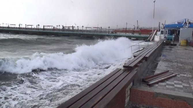 Tekirdağ'da 2 gündür devam eden şiddetli lodos sebebiyle sahil kenarında bulunan kafelerin dev şemsiyeleri devrilirken, mermer taşları da yerinden oynadı. Ayrıca sahile taşan deniz suyu ise geri çekildi.