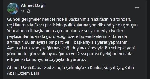Sosyal medya üzerinden de istifa ettiklerini duyuran yönetim kurulu üyeleri, açıklamalarında "Güncel gelişmeler neticesinde il başkanımızın istifasının ardından, teşkilatımızda Deva Partisi'nin politikalarına yönelik endişe oluşmuştu. Yeni atanan il başkanının açıklamaları ve sosyal medya paylaşımlarından da görüleceği üzere bu endişelerimiz daha da artmıştır. Bu anlayışta bir parti ve il başkanıyla siyaset yapmanın Aydın'a bir kazanç sağlamayacağı düşüncesindeyiz. Bu sebeple yeni yönetimde görev almayacağımızı ve Deva Partisi üyeliğinden istifa ettiğimizi kamuoyuna saygıyla duyururuz" ifadeleri yer aldı.