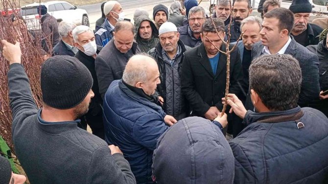 Kaymakamı Kadir Yurdagül, Tarım ve Orman İlçe Müdürü Murat Ödoğlu, fidan dağıtımının ardından çiftçilerle hatıra fotoğrafı çekti.