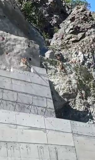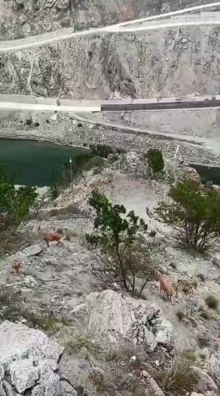 Artvin'de Deriner Barajı çevresindeki dik yamaçlara çıkan yaban keçileri adeta yer çekimine meydan okuyor.