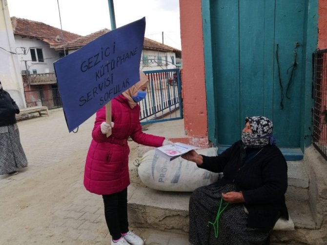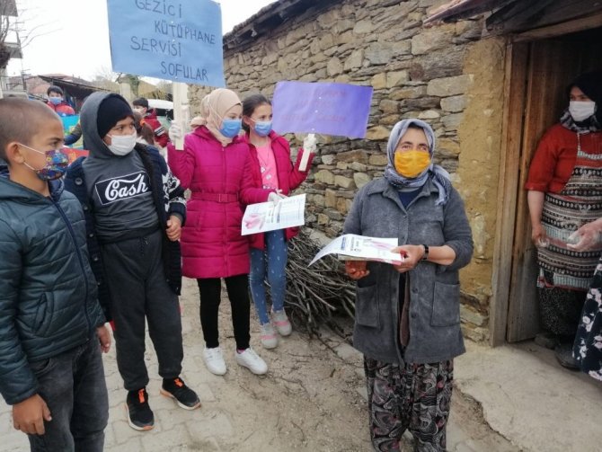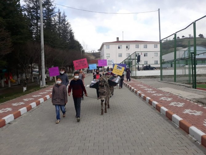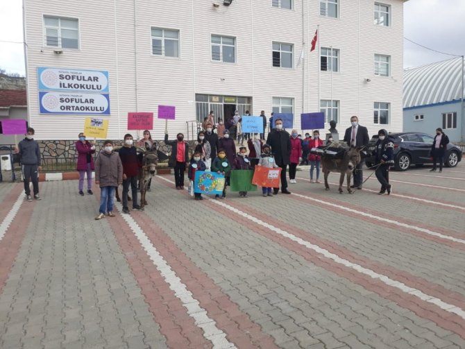 Kütahya'nın Pazarlar ilçesine bağlı Sofular köyündeki ilk ve ortaokul öğrencileri, kitap okumanın önemine dikkat çekmek için vatandaşlara eşek ile kitap dağıttı.