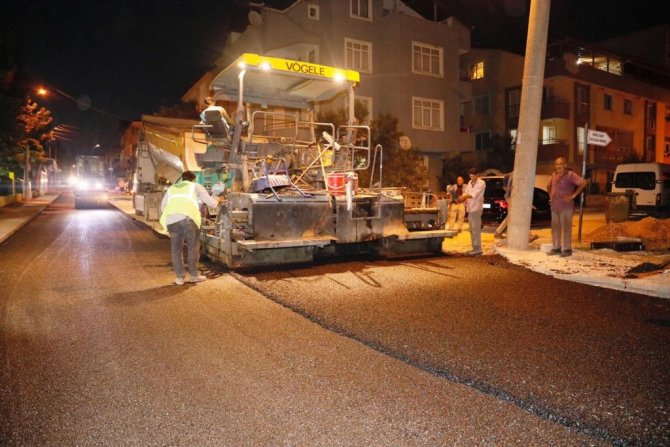 Altyapısı biten bölgelerde gece devam eden asfalt çalışmasını inceleyen Körfez Belediye Başkanı Şener Söğüt, finişher makinesinin koltuğuna geçerek sıcak asfalt döktü.