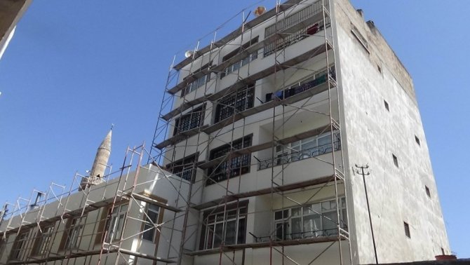 Kilis'te Dolap Pazari Caddesi'nde dış cephe giydirme çalışmaları sürüyor.
