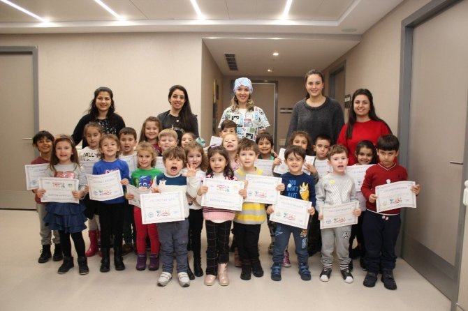 Kent Bayraklı Tıp Merkezi Pedodonti Uzmanı Dr. Bengi Aydınel, bir grup anaokulu öğrencisine “diş hekimi ve koltuğu”ndan korkulmayacağını “dene-gör” formülüyle öğretti. Kullandıkları aletleri de tek tek anlatıp tanıtan Dr. Aydınel, onların korkusuzca muayene koltuğuna oturmalarını sağladı, sonunda da minikleri “cesaret belgesi” ile ödüllendirdi.