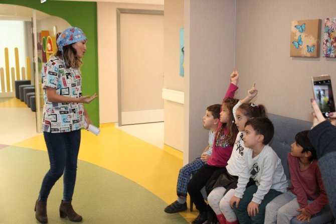 Kent Bayraklı Tıp Merkezi Pedodonti Uzmanı Dr. Bengi Aydınel, bir grup anaokulu öğrencisine “diş hekimi ve koltuğu”ndan korkulmayacağını “dene-gör” formülüyle öğretti. Kullandıkları aletleri de tek te...