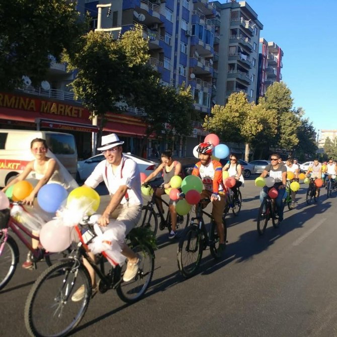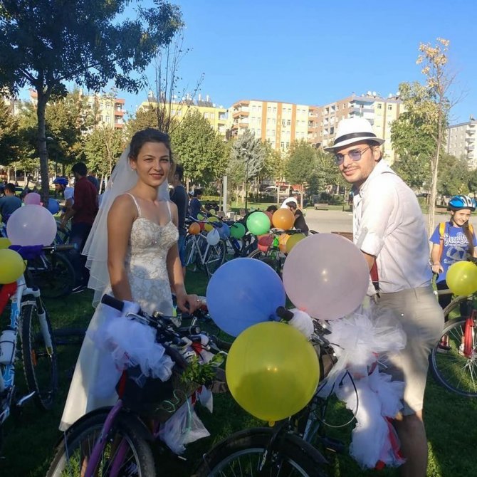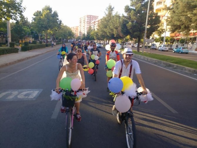 Diyarbakırlı bisiklet tutkunları Süleyman ve Özge, düğün konvoyunu, araca binmek yerine bisiklete binip Diyarbakır turu atarak gerçekleştirdi.