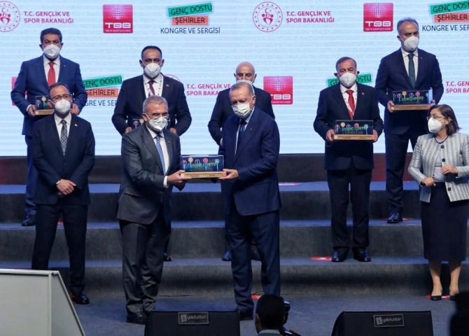 Cumhurbaşkanı Recep Tayyip Erdoğan, "Genç Dostu Şehirler Fikir ve Proje Yarışması'nda destek almaya hak kazanan Diyarbakır Büyükşehir Belediyesinin ödülünü Vali Münir Karaloğlu'na verdi.
