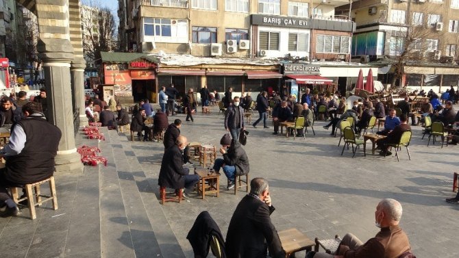 Korona virüs vaka sayılarında büyük düşüş yaşandığı iller arasında yer alan Diyarbakır'da tedbirler ve kuralları hiçe sayıldı. Kentin Yenişehir ilçesi Ofis semtinde bulunan Konukevi önüne sandalyelerini atan vatandaşlar korona virüs tedbirlerini hiçe sayıp çay keyfi yaptı. Yaşanan yoğun kalabalıkta çevrede bulunan kıraathane işletmecileri de sandalyeleri meydanın bulunduğu yere atarak burada oturanlara çay servisi yaptı.