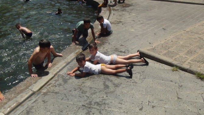 Diyarbakır'da termometreler 41 dereceyi gösterdi. Asfaltın adeta buharlaştığı ilde sıcaktan bunalan çocuklar parktaki süs havuzlarında serinledi.