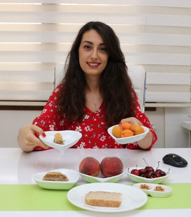 Bir dilim baklava yemek isteyenlere önerilerde bulunan Diyetisyen Bengü Ünal, "Bir küçük dilim baklava illa olsun derseniz de yaklaşık 1 küçük dilim baklavanız, 2 porsiyon meyve, 2 tane ceviz, 1 dilim ekmek yerine geçmektedir. 2 porsiyon meyvelerimiz ise 2 tane şeftali, 24 tane kiraz ve 4 tane kayısıya denk gelmektedir. Bunlardan hangisini azaltmak istiyorsanız. Kendi listenizden çıkartıp bir küçük baklavayı tercih edebilirsiniz" ifadelerini kullandı.