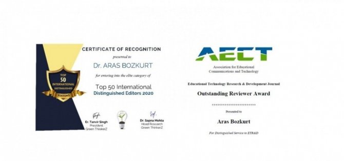 Doç. Dr. Bozkurt ayrıca, geçtiğimiz günlerde Green ThinkerZ tarafından verilen 2020 En İyi Uluslararası 50 Seçkin Editör Ödülü (Top 50 International Distinguished Editors 2020) ve Educational Technology Research and Development tarafından verilen 2020 Sıradışı Hakem Ödülü'nü (Outstanding Reviewer Award 2020) almaya hak kazanarak önemli bir başarıya daha imza atmıştı.