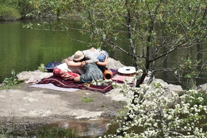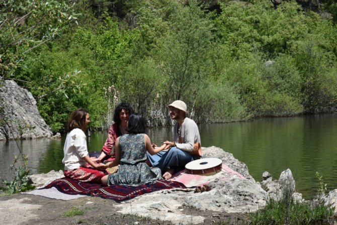 Doğal şehir olarak bilinen Sındırgı'nın Kürendere göleti kenarında gezgin gençler müzik ile terapi yaptılar.