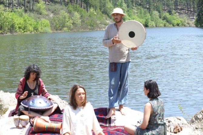 Doğal şehir olarak bilinen Sındırgı'nın Kürendere göleti kenarında gezgin gençler müzik ile terapi yaptılar. Mistik enstrümanlarını doğaya taşıyan müzik terapisi uzmanı Öksem Aykut, Sındırgı'nın eşsiz doğasında ses terapisi gerçekleştirdi.