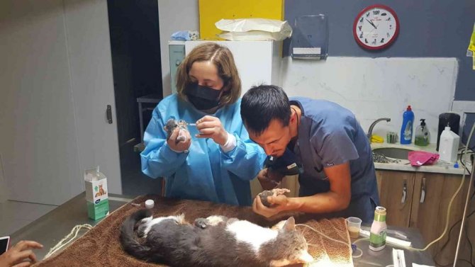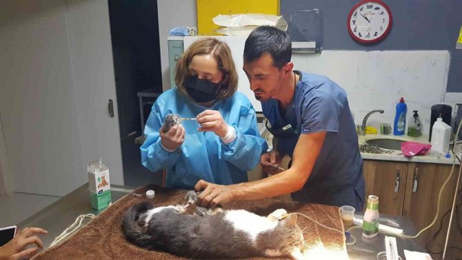 İzmir'in Tire ilçesinde ilk yavrusu doğum kanalına sıkıştığı için doğumu geciken kedi, veteriner kliniğinde uygulanan sezaryen ile sağlıklı 5 yavru dünyaya getirdi.
